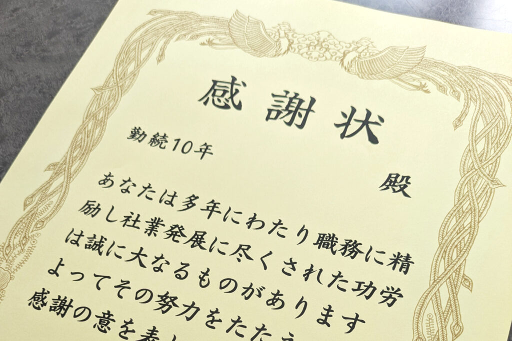 長くご活躍いただいた社員には感謝の気持ちを込めて、以下の節目で表彰を行っています。 10年・20年・30年・40年の勤続年数に応じて、報奨金を贈呈します。